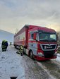 Aufgrund winterlicher Straßenverhältnisse blieb ein LKW auf der Fahrbahn hängen und blockierte einen schmalen Güterweg.